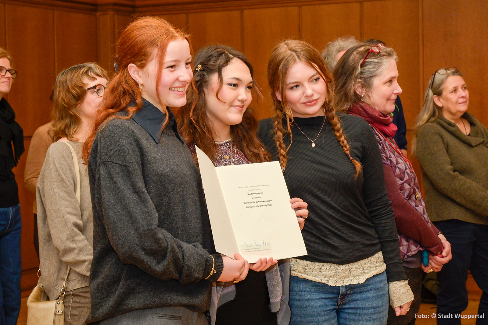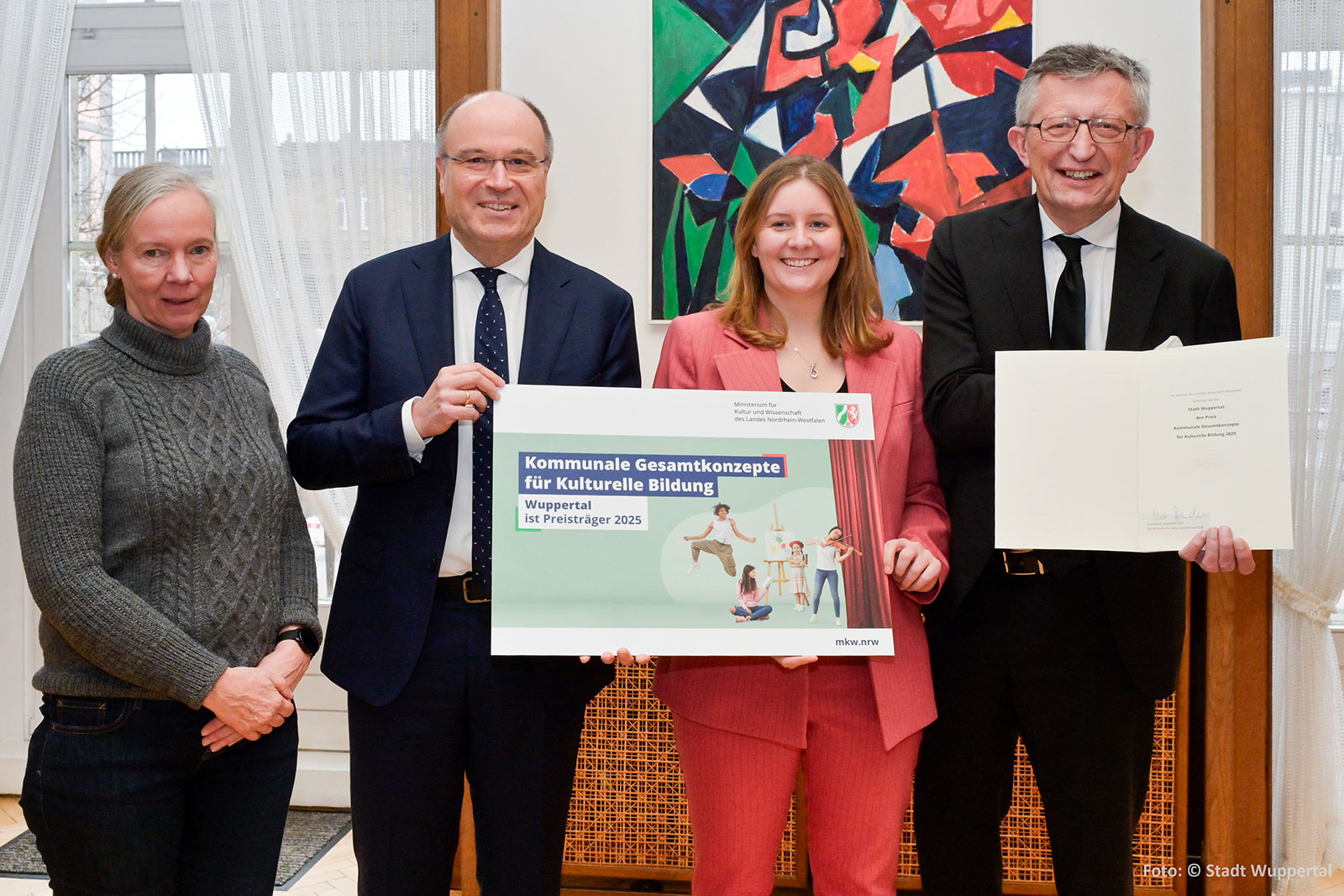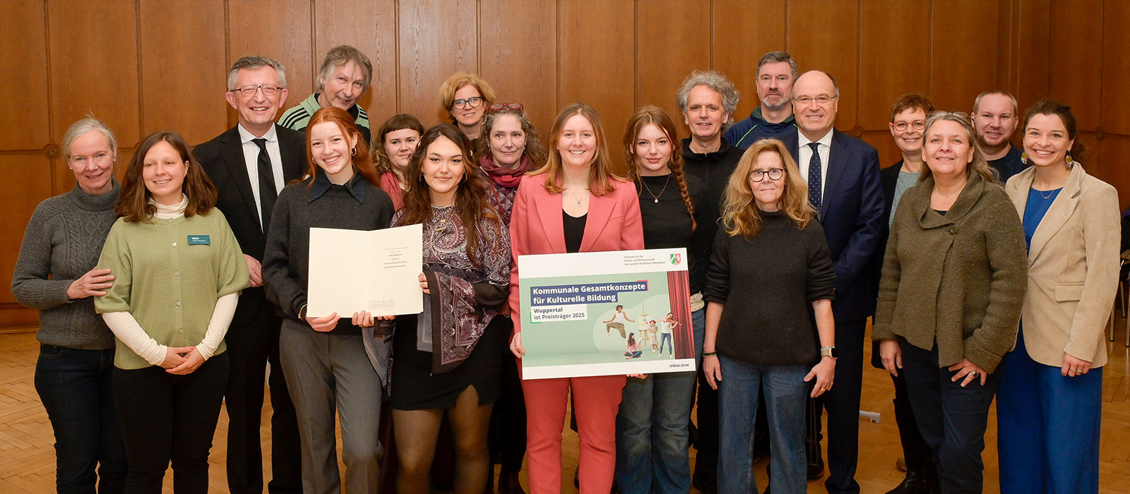 NRW-Landespreis 2025 für das Gesamtkonzept Kulturelle Bildung Wuppertal Die Stadt Wuppertal bekommt zusammen mit der Freien Kulturszene den NRW-Landespreis 2025 für das Gesamtkonzept Kulturelle Bildung Wuppertal verliehen. Preisübergabe durch Michael Reitemeyer, Abteilungsleiter Kultur im Ministerium für Kunst und Wissenschaft. v.l. // Christine Weinelt, Nicole Stollenwerk, Matthias Nocke, Jamila Berghoff, Andreas von Hören, Janina Smits, Mariam Saftari, Ulrike Münter, Miriam Scherff, Marlene Kotthoff, Björn Krüger, Irmgard Stinzendörfer, Michael Reitemeyer, Bettina Paust, Andrea Raak, Lehrer Pina Bausch Gesamtschule, Julia Berg / Nicht im Bild: Dagmar Beilmann, Sonja Bauhauer / Foto: Stadt Wuppertal Als Arbeitsgruppe Kulturelle Bildung Wuppertals freuen wir uns, dass – wie bereits im Jahr 2022 – die Stadt Wuppertal auch in diesem Jahr mit dem NRW-Landespreis für Kulturelle Bildung 2025 ausgezeichnet worden ist. Das ist ein starkes Zeichen in einer gesellschaftlichen Situation, in der Selbstwirksamkeit und ein zukunftsfähiges Zusammenwirken enorm wichtig sind. Ende Januar 2026 übergab im Rathaus der Stadt Michael Reitemeyer, Abteilungsleiter Kultur, vertretend für das Ministerium für Kunst und Wissenschaft mit Ministerin Ina Brandes – den Preis und Förderbescheid in Höhe von 15.000 Euro. Michael Reitemeyer überreichte ihn der Oberbürgermeisterin Miriam Scherff, dem Kulturdezernenten Matthias Nocke und vor allem all den Aktiven, die das Gesamtkonzept Kulturelle Bildung in Wuppertal ermöglicht haben. Mit dem Landespreis zeichnet das Ministerium Städte und Kreise aus, die hervorragende strukturelle Bedingungen schaffen, um Kindern, Jugendlichen und Menschen allen Alters einen frühen Zugang zu Kunst und Kultur zu erleichtern. „Ich finde es toll, dass wir hier in Wuppertal schon bei den ganz Kleinen mit der kulturellen Bildung anfangen und dies in allen Altersgruppen weiterführen. Ich bin stolz auf alle Mitglieder des Arbeitskreises, sowie auf die zahlreichen Vereine und Institutionen, die unseren kulturellen Bildungsplan tagtäglich mit Leben füllen“, hob Miriam Scherff beim Empfang am 23.1.26 hervor, bei dem neben Kulturdezernent Matthias Nocke auch die Leiterin der Akademie Kulturelle Bildung in Remscheid Sonja Baumhauer, der Wuppertaler Landtagsabgeordnete Andreas Bialas und zahlreiche Akteur*innen aus der Kulturszene dabei waren. „Als Alleinstellungsmerkmal Wuppertals in ganz Nordrhein-Westfalens“, hob Michael Reitemeyer auch diesmal „die besondere Zusammenarbeit zwischen Freier Szene und Stadt“ hervor. Er betonte, dass „man die Leistung der Stadt Wuppertal hoch anerkennen muss. Diese Auszeichnung nach 2022 ein weiteres Mal zu erhalten, spricht für eine sehr ordentliche Arbeit“. Er betonte die Fülle der kraftvollen Veranstaltungen zur Kulturellen Bildung der letzten Jahre, wie „Festival gegen Krieg und Rassismus“ und die Arbeitsgemeinschaft „Junge Perspektiven“. Vielfältige Kooperationen machen diese Arbeit aus, wie mit dem Kulturkindergarten, dem Neuen Kunstverein, der börse, der Bergischen Musikschule, dem Von der Heydt-Museum“ und vielen einzelnen Akteur*innen. Entstanden ist der ganze Prozess aus Impulsen der Freien Szene und in Begleitung der engagierten Arbeitsstelle Kulturelle Bildung NRW, zusammen mit dem Kulturbüro Wuppertal. Besonderer Fokus liegt aktuell auf den Perspektiven und Bedarfen junger Menschen, die bei der Preisverleihung bereits über Filmclips mit Statements greifbar wurden. Kern ist aktuell die bevorstehende Einrichtung einer Koordinierungsstelle Kulturelle Bildung, die schon im ersten Gesamtkonzept benannt wurde und wesentlich als zentraler Motor für den weiteren Prozess Kulturelle Bildung in Wuppertal ist. Kontakt und weitere Informationen E-Mail an kulturellebildung@fnwk.de PDF Download Gesamtkonzept Kulturelle Bildung Wuppertal 2025 // 1.222 KB Eindrücke von der Preisvergabe v.l. // Christine Weinelt, Michael Reitemeyer, Miriam Scherff, Matthias Nocke / Foto: Stadt Wuppertal v.l. // Sinja Baumhauer, Lehrer der Pina Bausch Gesamtschule, Bettina Paust / Foto: Stadt Wuppertal v.l // Jamila Berghoff, Mariam Saftari, Marlene Kotthoff / Foto: Stadt Wuppertal v.l // Irmgard Stinzendörfer, Björn Krüger / Foto: Stadt Wuppertal v.l. // Dagmar Beilmann, Ulrike Münter / Foto: Stadt Wuppertal v.l. // Julia Berg, Andrea Raak / Foto: Stadt Wuppertal 12 TAGs: NRW-LandespreisKulturelle-Bildung-2025Freie-SzeneStadtWuppertalRathausPreisübergabePreisverleihungKulturpreis